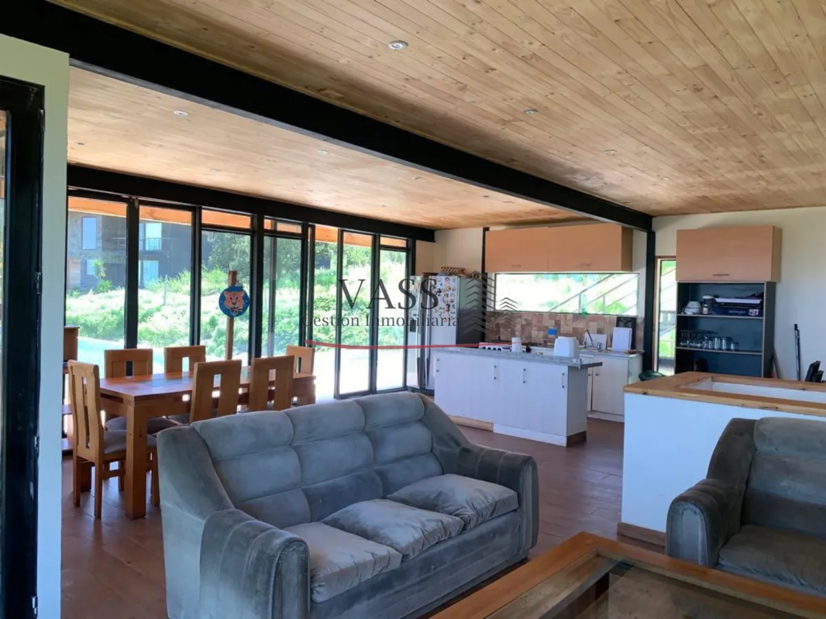 Casa amoblada, 4 dormitorios con closet, living comedor amplio con gran luz natural, 2 baños completos principal en suite, cocina estilo americano equipado con muebles y electrodomésticos, bodega, terraza con vista al campo, piscina con linda vista, áreas verdes, estacionamiento y acceso controlado y automático a la parcela.